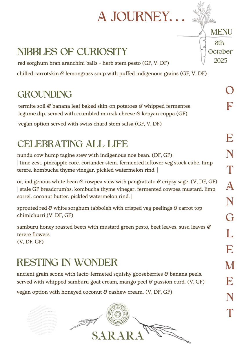 As our work bridges the gap from regenerative farms to five-star kitchens, we’ve come to see food as a powerful, and delicious, form of conservation. We often say that food should be central to any sustainability or wildlife conservation effort – after all, everyone eats, and what ends up on your plate shapes landscapes far beyond your view. This belief led us to partner with lodges like Sarara Camp in Northern Kenya’s Namunyak Conservancy. Sarara is famed for its community-based wildlife conservation, and together with our friends at Give a Scrap (a Nairobi-based zero-waste food collective founded by Tash Straker), we designed a special ‘journey of entanglement’ culinary experience for their guests – Earth.One and to.org and the lodge’s chefs joined us to explore these diverse ingredients and discombobulating concepts.