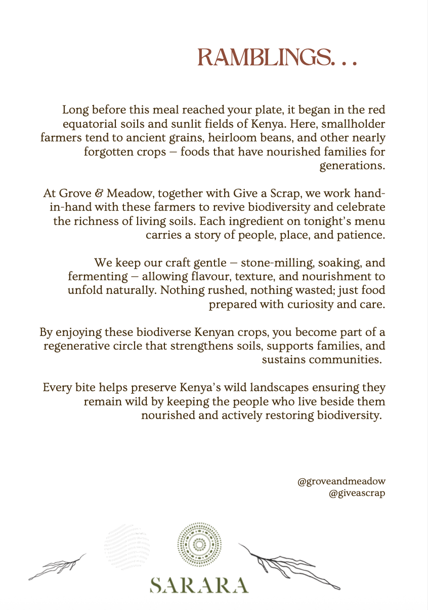 At Sarara Camp in Northern Kenya, chefs teamed up with Grove and Meadow and Give a Scrap to reimagine what sustainable dining looks like. In the heart of the Mathews Range under the day before’s full moon we designed a culinary experience in zero-waste cooking, indigenous, heirloom ingredients and ancient, patient processing techniques.