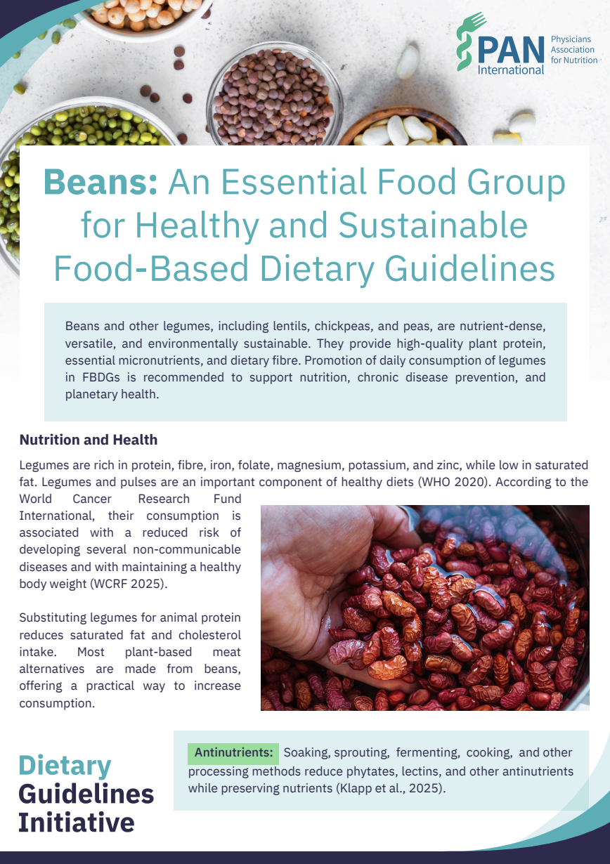 Beans and other legumes remain one of the most important food groups promoted by the Physicians Association for Nutrition (PAN International) in dietary guidelines worldwide, supported by a strong evidence base. Legumes offer a valuable combination of plant protein, essential micronutrients, and dietary fibre (a nutrient of we need more of in many populations).