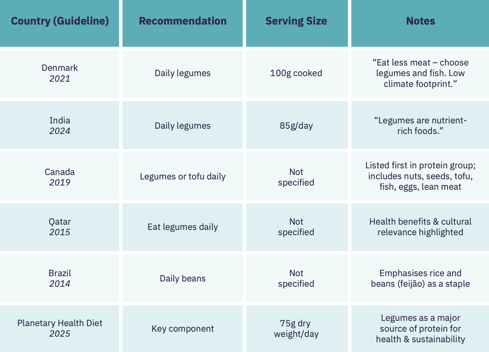 Encouraging examples do exist. The 2025 EAT-Lancet Commission report recommends 75 grams of dry legumes per day, offering a precise benchmark. Denmark advises 100 grams of cooked legumes daily and supports this with visual guidance that translates recommendations into realistic portions. Such approaches are particularly helpful, as perceived portion sizes can discourage consumption, despite legumes being easy to incorporate into everyday meals.