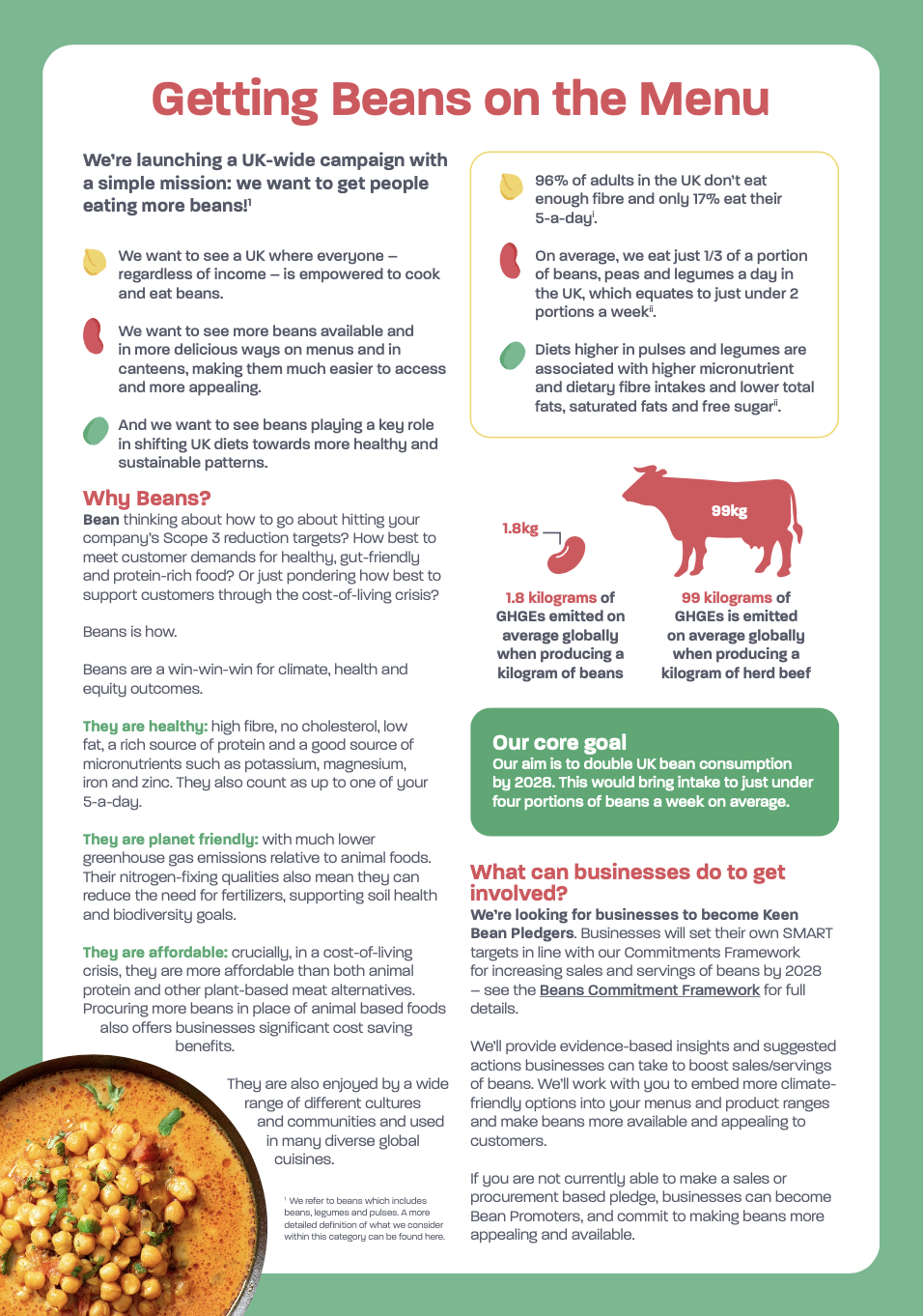 Curious to understand more about how incorporate more beans into your menus and why beans make good business sense? Use this resource to guide you on how to get involved and make a Keen Bean pledge! All keen bean pledgers commit to support our shared goal of doubling UK bean consumption by 2028!