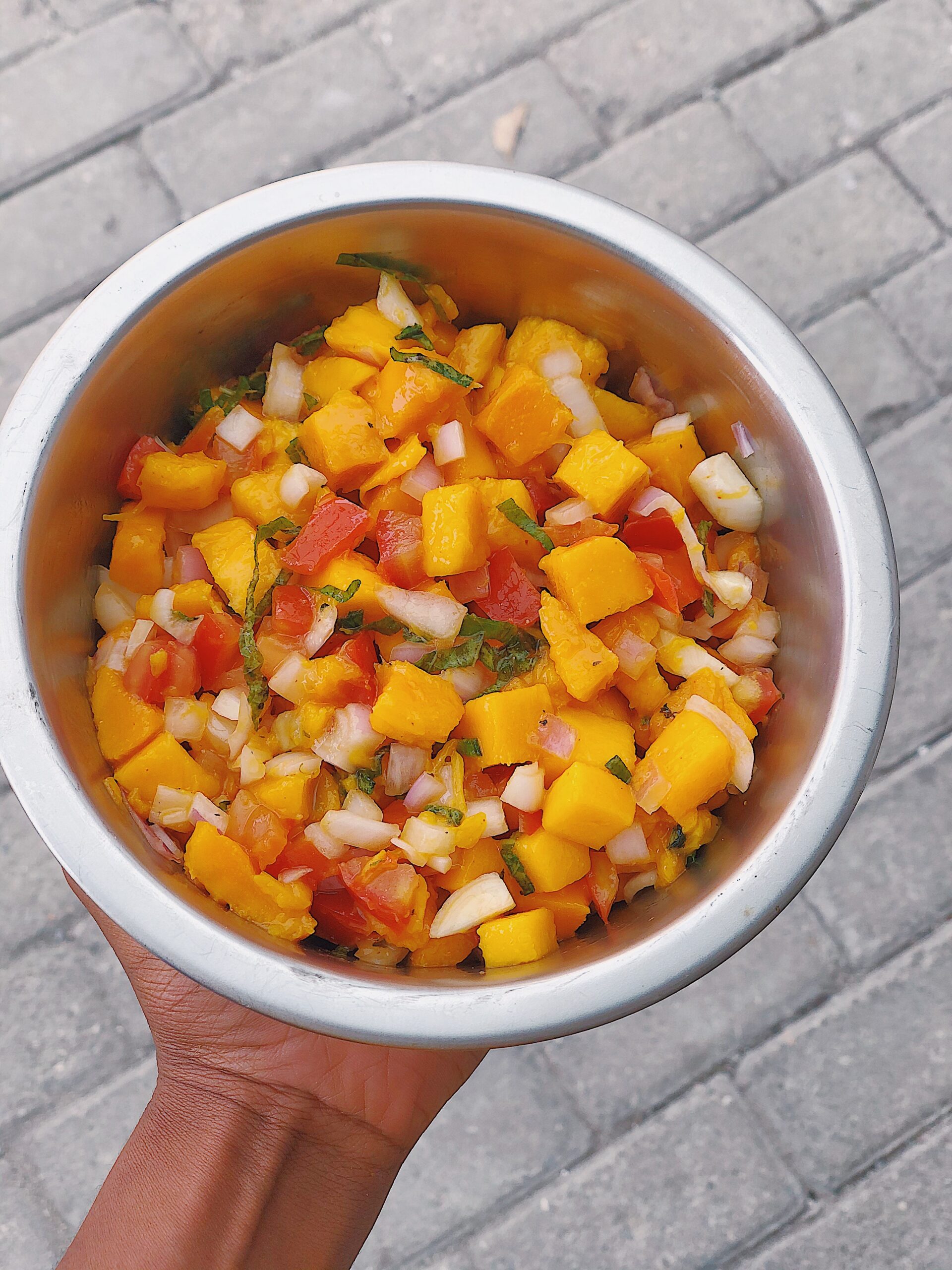 – Finely chop scent leaves. - In a medium bowl, add mango, onions, and tomatoes.